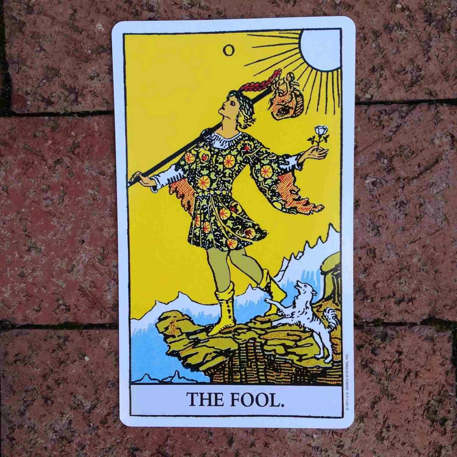 And when we turn the first card of the Rider Waite Tarot’s Major Arcana, we meet The Fool (0) – a blithe, free spirit, arms thrown wide, ready to embrace the world that lies before him. The sky is clear, the sun shines, a white dog leaps joyfully at The Fool’s feet. He carries everything he needs with him. Off in the distance, sharp peaks rise, hinting at difficulties to come, but they are not for today.